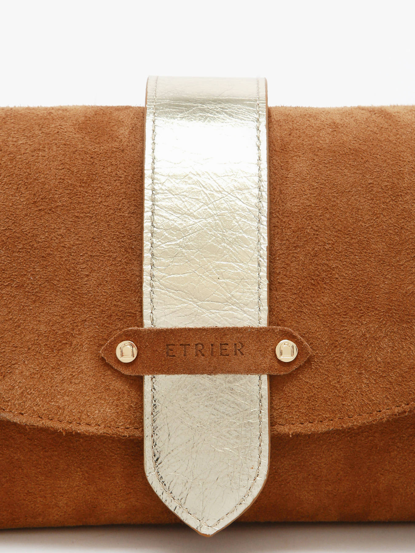 L'intérieur, entièrement doublé en cuir doré, comprend trois compartiments dont un central zippé, permettant d'organiser vos effets personnels avec confort et élégance. Le fond rigide assure un maintien optimal et une belle tenue au quotidien. Le logo ETRIER, embossé sur du cuir naturel, est accompagné d'un petit drapeau français, symbole discret du savoir-faire artisanal.